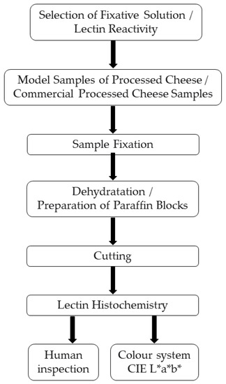 This work took place in several steps, which are shown in Figure 1. First, the method of sample fixation and the concentration of lectins used to test individual cheese samples were tested. Subsequently, the parameters of CIE L*a*b* and LoD were determined.