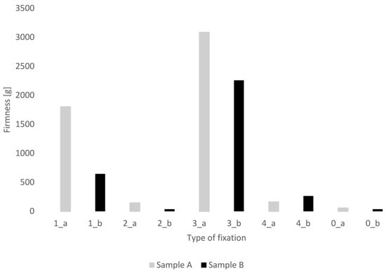 The graph shows that samples fixed in AFA fixative solution (1_a—1805.38 g and 1_b—645.65 g) have the most suitable consistency because these samples were not soft and remained compact. A suitable fixation has to strengthen and make it hard enough to minimize the damage and reduce the deformation during dehydration, embedding, and cutting [21]. The differences in values between the samples are most likely given by composition. For example, hydrocolloids have a significant impact on the texture profile, such as hardness, cohesion, springiness, chewing, and gumminess [39].