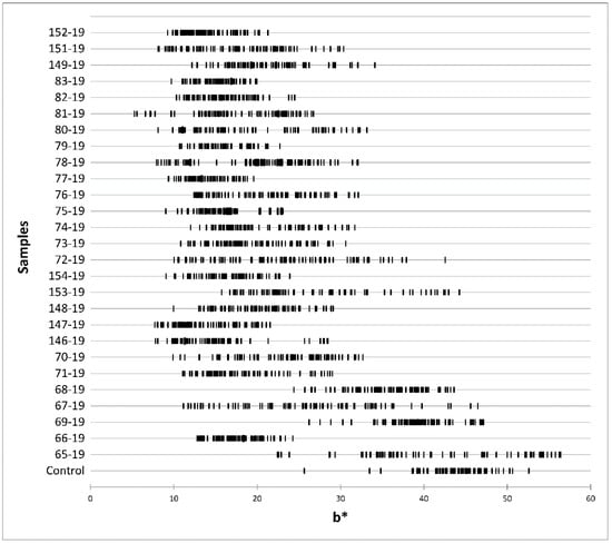 Individual value plot of CIE b* measurement variability of retail market samples.