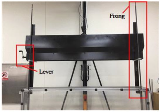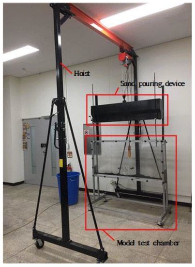 The literature contains several studies that used a sand-pouring device to generate uniform sandy soil in model chambers [13,14,15,16]. In this study, a 1500 mm × 100 mm (width × height) sand-pouring device was used (Figure 3 and Figure 4). The lever on the left side of the device was used to control the pouring of sand. The height of the device was adjusted with a hoist according to the height of the sand accumulated in the chamber so that the relative density of the sandy soil inside the chamber could be held constant.