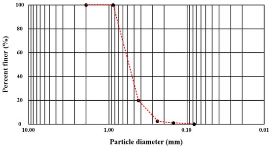 Joomunjin standard sand was used in this study to measure the relative density of sandy soil. Jumunjin sand is the standard sand used for research in Korea. Many experiments and continuous studies on material properties have been conducted using this sand. Hence, in this study, model tests were performed using this sand. The particle size distribution curve of the Joomunjin standard sand is shown in Figure 7. The particle size distribution of the sand was uniform. A uniformity coefficient (Cu) of 1.93 and a curvature coefficient (Cc) of 1.09 were observed, with grain-size distribution D10 = 0.331 mm, D30 = 0.480 mm, and D60 = 0.639 mm. The characteristics of the Joomunjin standard sand are as follows [19]: