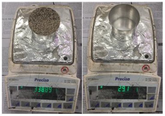 Distinguishing between dense and loose sand is important for understanding sand behavior [20]. In general, the volume of loose sand decreases under shear force, whereas the volume of dense sand expands. In this study, uniform sandy soil was prepared during the laboratory model test using the sand pouring device, and the relative density of the soil was measured using a moisture-based technique: the unit dry weight was found using the volume of the moisture can and the measured weight of the sand (Figure 8), and the relative density was calculated by referring to the cyclic-triaxial-test measurements of Kim et al. [21] (Table 2). The relative density is