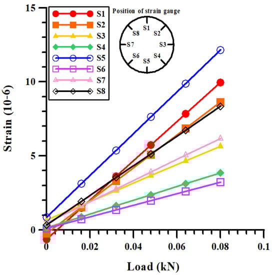 Eight strain gauges were calibrated and attached to the inside of the tunnel to investigate its behavioral characteristics. For tunnel calibration, the changing strain gauge values were measured with a data logger and a computer using the load control method (LCM), which directly applies a load to the tunnel. Load was applied to the crown of the tunnel, and the following equations were derived using the applied load and the strain gauge values. The eight equations were matched with the eight strain gauges, as shown in Figure 5. Figure 9 shows the calibration results obtained by converting the strain measured using each strain gauge into a force. A linear regression analysis was conducted as follows: