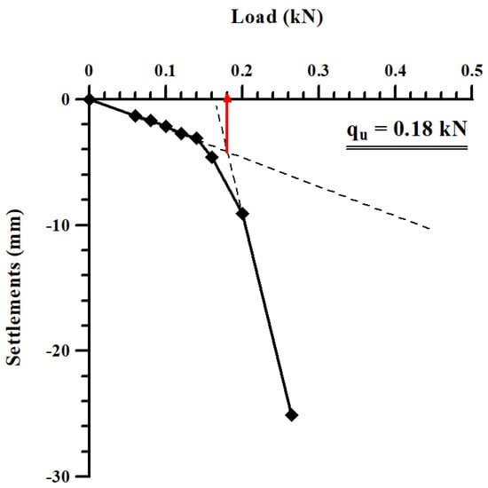 To obtain the surcharge loads acting on the pile during the model test, the relationship between the load and settlement was expressed in a P–S curve using LCM. The P–S curve was obtained by gradually increasing the load using a weight after connecting the model pile to the loading device. An ultimate load of 0.18 kN was obtained following Bulter et al. [23], and an allowable load of 0.06 kN was calculated considering a safety factor of 3. Figure 10 shows the P–S curve for the settlement according to the cumulative load.