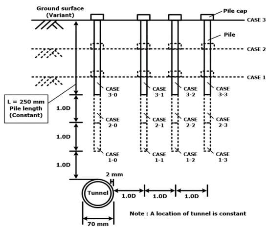 In this study, a laboratory model test was conducted for 12 cases based on vertical pile–tunnel offsets of 1.0 D, 2.0 D, and 3.0 D and horizontal pile–tunnel offsets of 0 D, 1.0 D, 2.0 D, and 3.0 D (Figure 11). In the names of the cases, the first number represents the vertical offset, and the second number represents the horizontal offset.