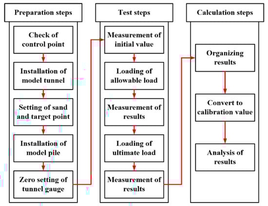 The calibration results above, as well as the allowable and ultimate loads obtained from the P–S curve, were applied to the 12 cases. The laboratory model test was divided into a preparation step, a test step, and a calculation step. In the preparation step, sandy soil was prepared in the chamber, and the parameters of the model tunnel and model pile were set. In addition, a linear variable differential transformer (LVDT) was installed to measure surface settlement, and the strain gauges of the model tunnel were connected to the data logger. In the test step, surcharge loads (allowable and ultimate loads) were applied to the model pile in sequence, and the surface settlement and strain gauge values of the model tunnel were measured. Finally, in the calculation step, the data obtained in the test step were converted and analyzed to complete the laboratory model test. Figure 12 shows each step of the test procedure.