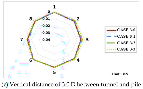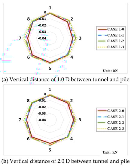 As shown in Figure 25 and Figure 26, when the allowable load was applied to the pile, the axial force acting on the crown of the tunnel gradually decreased. Compared to case 1-0, cases 1-1, 1-2, and 1-3 were lower by 6.9, 37.7, and 78.7%, respectively. In the case of the side wall, the axial force was larger than that acting on the crown. Compared to case 1-0, where the pile was immediately above the tunnel, the decrease rates of cases 1-1, 1-2, and 1-3 were reduced to be 21.6%, 49.7%, and 69.3%, respectively. When the vertical offsets were 2.0 D and 3.0 D, as the pile moved from the position immediately above the tunnel (0.0 D) to 1.0 D, 2.0 D, and 3.0 D in the horizontal direction, the axial force acting on the crown of the tunnel showed a tendency to sharply decrease by 8.3, 43.9, and 88.1% and by 8.1, 26.7, and 50.1%, respectively. The axial force acting on the side wall also decreased by 42.0, 59.9, and 61.9% and by 8.2, 31.6, and 47.9%, respectively, indicating that the influence of the pile on the tunnel decreased when the pile was farther away. This tendency was also observed when the ultimate load was applied to the pile. The axial force acting on the crown decreased by 3.31, 25.4, and 84.3% (vertical offset: 1.0 D); by 7.4, 65.5, and 71.1% (vertical offset: 2.0 D); and by 6.1, 29.5, and 49.8% (vertical offset: 3.0 D) compared to the case with the pile immediately above the tunnel. The axial force acting on the side wall decreased by 30.3, 49.7, and 70.0% (vertical offset: 1.0 D); by 29.9, 55.6, and 64.6% (vertical offset: 2.0 D); and by 7.7, 31.8, and 50.9% (vertical offset: 3.0 D). Therefore, securing a sufficient horizontal offset from the existing tunnel is necessary, and the appropriate separation distance found by analysis is consistent with the standards of Seoul.