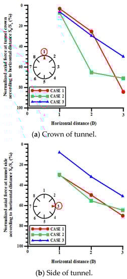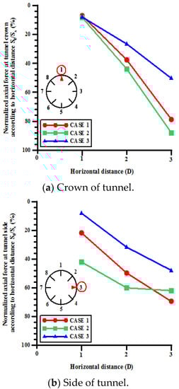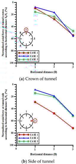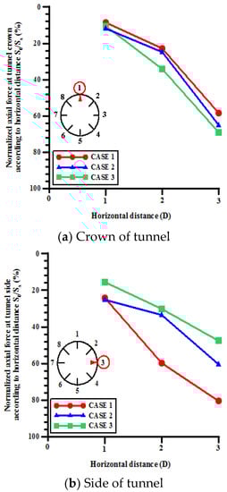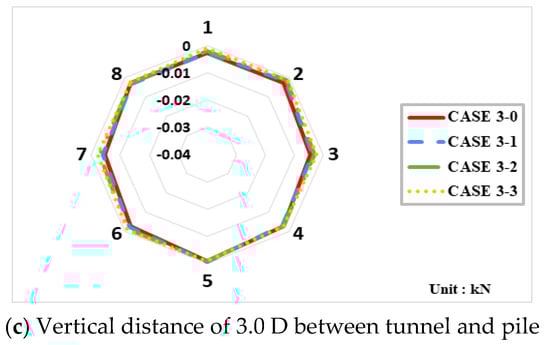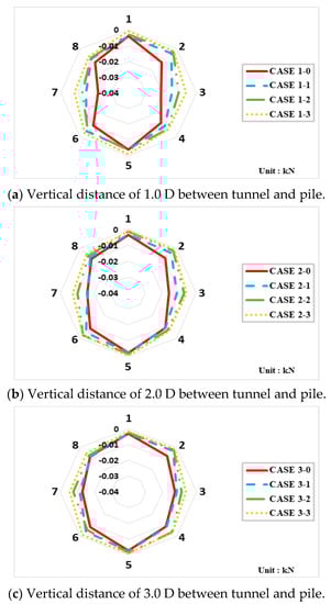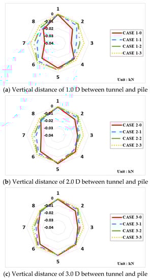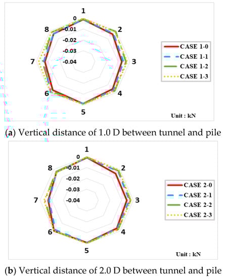 The axial forces acting on the tunnel were quantitatively compared for each case. Relative to that for case 1-0, the axial force for cases 1-1, 1-2, and 1-3 were reduced by 8.6, 22.7, and 58.6% at the crown and by 24.1, 59.6, and 80.3% at the side wall. When the vertical offset increased, the reductions were 11.9, 24.9, and 65.0% (when the vertical offset was 2.0 D) and 10.7, 34.0, and 68.9% (when the vertical offset was 3.0 D) at the crown and 25.0, 33.6, and 60.4% (2.0 D) and 15.6, 30.3, and 47.4% (3.0 D) at the side wall. The axial forces acting on the crown and side wall of the tunnel also sharply decreased according to the horizontal pile–tunnel offset (Figure 15).