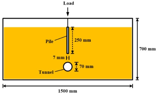 The numerical model simulated a pile and tunnel of the same size as those in the laboratory test in a 500 × 700 mm soil section (Figure 17). An allowable load of 0.06 kN and an ultimate load of 0.18 kN were applied to the pile. A numerical analysis was conducted for the 12 cases shown in Figure 11.