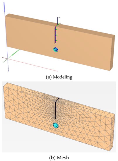 Numerical analysis was conducted under the same conditions as the laboratory model test. This study used Bentley’s PLAXIS 3D (ver. 21.01.00.479), which can conduct an overall geotechnical analysis (including the deformation and safety of soil and rock as well as the interaction between structures and the ground) based on the finite element method [24].