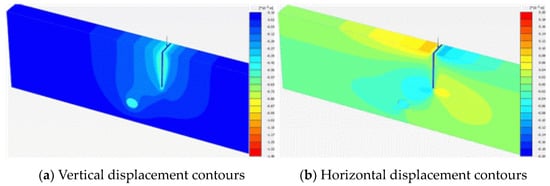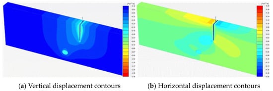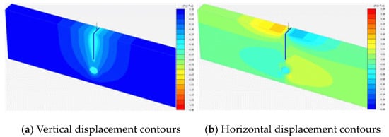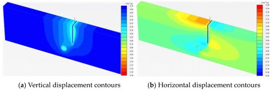 Figure 19, Figure 20, Figure 21 and Figure 22 show the simulation results for the vertical and horizontal displacement contours generated in the lower tunnel when the allowable loads were applied to the pile. As the offset between the tunnel and piles increased by 1.0 D, the effect on the tunnel by the pile installation decreased. As Figure 22 shows, the tunnel was farther outside of the influence area due to the pile installation compared to other cases where the distance was close. Figure 23 and Figure 24 show the simulation results for the axial force generated in the lower tunnel when the allowable and ultimate loads were applied to the pile. When the allowable load was applied, the axial force acting on the tunnel according to the horizontal pile–tunnel offset decreased as the vertical offset decreased. When the ultimate load was applied, the magnitude of the axial force acting on the side wall of the tunnel changed significantly as the horizontal pile–tunnel offset increased.