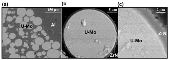 - Keiser, D.D.; Perez, E.; Wiencek, T.; Leenaers, A.; Berghe, S.V.D. Microstructural characterization of a thin film ZrN diffusion barrier in an As-fabricated U–7Mo/Al matrix dispersion fuel plate. J. Nucl. Mater. 2015, 458, 406–418. [Google Scholar] [CrossRef] [Green Version]