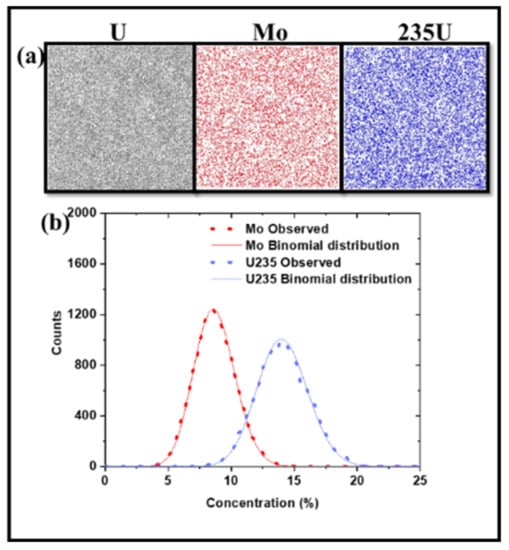 (a) 50 × 50 × 5 nm cuboid showing distribution of U, Mo, and 235U isotope. (b) Observed and binomial distribution of Mo and 235U isotope in analyzed volume obtained using APT from as-received U-7 wt.% Mo.