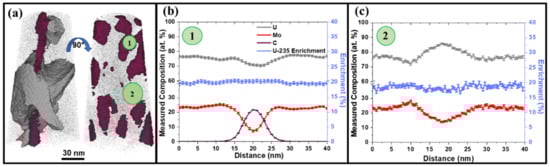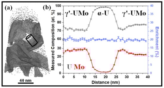 APT analysis was conducted from the specimen prepared from the lamellar microstructure-like features identified using electron microscopy shown in Figure 1c. The thickness of the lamellar microstructural features varied from 5 to 15 nm, as shown in Figure 3a,b, with the iso-concentration surface and the 1D plot taken across one of the lamellar-like structures indicated in Figure 3a. Concentration profiles indicate that these features contain nearly 100 at.% U, consistent with previous identification, as α-U while adjacent to these lamellar structures consists of Mo-enriched γ-U-Mo [35,36]. Note that these decompositions of γ-U-Mo into α-U did not affect enrichment levels, as expected.