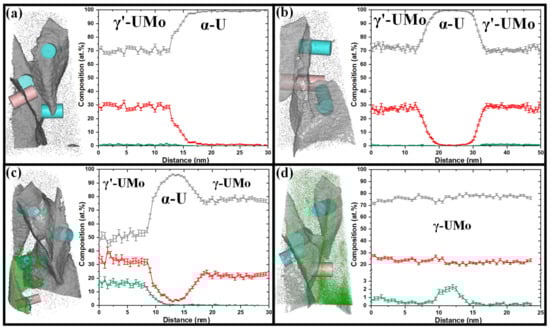 Specimens prepared from the network of lamellar structures also revealed multiple interfaces in a single tip, as shown in Figure 4a–d. The cylinders highlighted on the left of the subfigures show where a 1D profile is taken along different interfaces. The analysis revealed that the presence of Mo enriched γ’-U-Mo, α-U, γ’-U2Mo, and grain/cell boundaries, showing segregation of Si. Note that APT analysis for these samples could not provide crystallographic orientation across the boundary, hence it is not possible to make a distinction between grain and cell boundaries. They have been demonstrated to almost always coincide in fresh fuel. The presence of a grain boundary in the analyzed volume suggests precipitation in the form of a lamellar-like microstructure consisting of different phases of U and Mo.