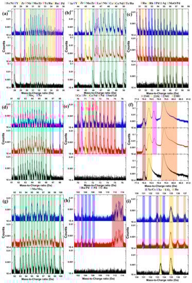 Mass spectrum in the range of 28 to 137 Da from unirradiated U-7 wt.% Mo alloy (black, lower spectrum), M11 at 52% LEU burnup (red, center spectrum), and M14 at 66% LEU burnup (blue, top spectrum). All plots from 3 samples are normalized to 238U3+ peak. Sub figures from (a–i) are from different part of mass spectrum. Different color codes identified above each sub figures are used to identify U, Mo, and individual fission products.