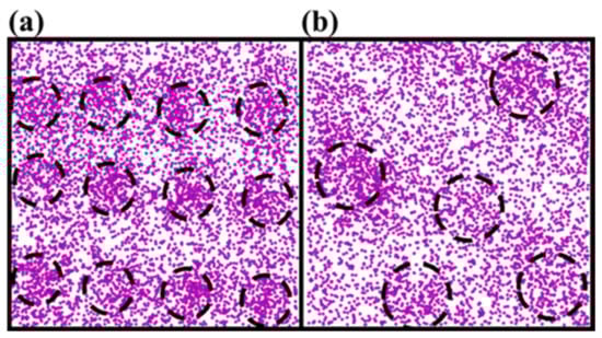 18 × 18 × 2 nm3 slice showing distribution of fission products observed from APT data in (a) M11 and (b) M14 samples, respectively. Dotted circles are used to highlight enriched segregation of fission products.