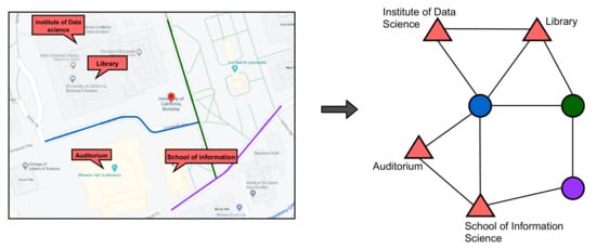 In this article, we consider a heterogeneous graph representation as a directed graph representation. We follow the traditional definitions of concepts from graph theory. See Table 2 for a definition of graph concepts used in this article. Our focus is on deriving heterogeneous spatial representations for spatial elements. There are two challenges that need to be discussed. The first challenge is the difference between the physical representations of spatial elements and general network representation as defined by graph theory. We define the physical representations of spatial elements as the convention used for storing the elements in ubiquitous systems and geo-spatial data stores such as maps. Within the context of spatial elements, while certain types of spatial elements are physically represented as networks, others are not. Street networks are an example of spatial networks that usually are physically represented as networks. Because their physical representation follows the network conventions of graph theory, there is little to no additional overhead required to derive their graph representation. In this case, the graph representation of a street network could be one where the nodes are street segments and the edges indicate adjacency between the street segments. Other elements such as buildings and natural bodies are not necessarily represented physically as networks. Hence, at the very least, deriving their graph representations requires a scoping of the relations to be considered.