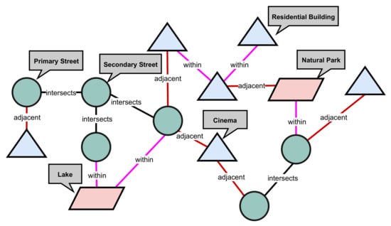 An abstract depiction of a heterogeneous graph representation of spatial entities. The triangles represents buildings, circles represents streets, parallelograms represents natural bodies. The relations between the entities is defined using relations such as the spatial within, spatial intersects, spatial adjacent.