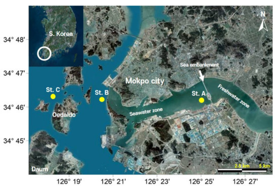 Turbulence occurs in estuaries due to their binary water layer structure, where freshwater meets seawater in a transition zone [8]. Estuaries, thus, harbor diverse species and are known to be highly productive systems due to nutrient loads from the adjacent land [9]. The production of organic matter per unit area is estimated to be 4–10-fold higher than in grainfields, and the ecological value per unit area is reported to be the highest among Earth’s ecosystems, at USD 22,832 ha−1 yr−1 [10]. The Youngsan River (YR) estuary, the target estuary in the present study, is located on the southwest coast of South Korea and has a temperate and monsoonal climate (E 126°26′–126°18′, N 34°49′–34°44′) [11]. A dike was constructed in 1981, and the resulting division between the freshwater and seawater zones transformed the YR estuary from a natural to an artificial estuary, with corresponding changes in water quality and environmental properties [12]. Since dike construction, the freshwater zone has experienced an increase in nutrient concentration and accelerated organic pollution [11], with recent incidences of hypoxia [13]. In the case of the seawater zone, although the normal state (negligible freshwater discharge) allows the physical properties and circulation to be controlled by tidal forcing, the opening of the sluice gate lets in a large quantity of freshwater that alters the physical properties and circulation in the estuary [14]. Moreover, with increased freshwater discharge during the summer season, there is an increase in the abundance of species that cause red tides [15,16].