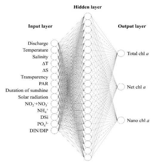 To investigate the phytoplankton variations and the regulatory factors in the altered and complex aquatic system of the YR estuary, an artificial neural network (ANN) was applied. An ANN is a model based on the mathematical description of the brain’s information-processing mechanisms that underlie human cognition and determination. The model is, thus, widely used in describing intricately related problems through learning [21,22,23,24,25]. Furthermore, ANNs are advantageous in that no mathematical relationship or assumption of data distribution is required; response time is relatively brief, and the prediction power improves with data accumulation. Ultimately, ANNs are a useful model in cases where identifying main regulatory factors is difficult due to the intricate connections among the biological, physical, and chemical factors. This describes the situation of phytoplankton variations in an altered estuary.