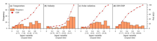 Histogram and cumulative distribution function (CDF) of original and transformed data for the input variables. (a) water temperature, (b) salinity, (c) solar radiation, (d) DIN/DIP ratio.