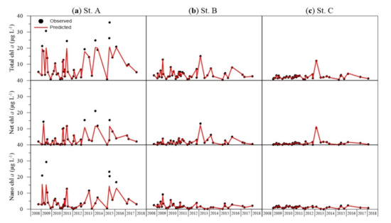 For the size-fractionated phytoplankton biomass, the predicted values obtained from the ANN model and actual measured values were compared (Figure 4). The results showed that the distributions of measured and predicted values were mostly similar across all sizes and sites. The predicted values of total chl a were slightly lower than the peaks measured at site A; otherwise, the accuracy was high across all periods and sites. The predicted net chl a was slightly lower than the peaks measured at Sites A and B. The predicted nano chl a showed a slight difference compared with the peaks measured at Site A. Otherwise, accuracy was high.