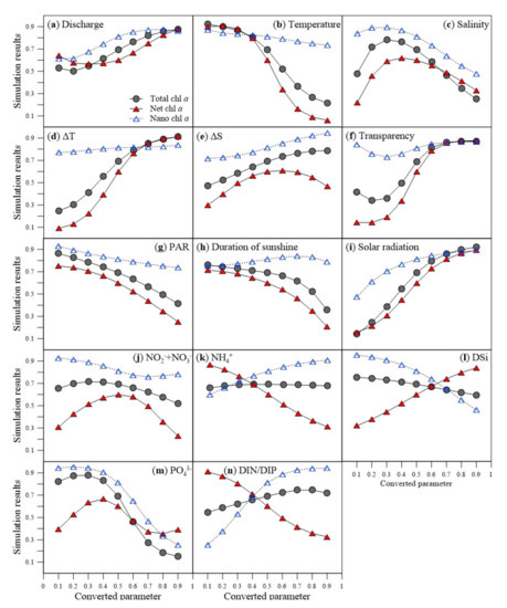 Relationship between input parameters (environmental factors) and predicted chlorophyll a values in the ANN modeling analyses. (a) fresh water discharge (dicahrge), (b) water temperature (temperature), (c) salinity, (d) surface and bottom temperature difference (ΔT), (e) surface and bottom salinity difference (ΔS), (f) transparency, (g) photosynthetically active radiation (PAR), (h) Duration of sunshine, (i) solar radiation, (j) nitrite + nitrate (NO2− + NO3−), (k) ammonium (NH4+), (l) dissolved silicate (DSi), (m) phosphate (PO43−), and (n) dissolved inorganic nitrogen to dissolved inorganic phosphorus ratio (DIN/DIP).
