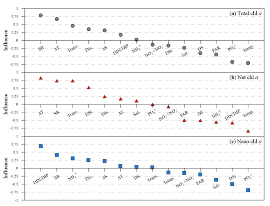 The influence (contribution level) of each environmental factor on size-fractionated phytoplankton biomass (Figure 6) showed that for total chl a the greatest influence came from SR, followed by water temperature, surface and bottom ΔT, PO43−, transparency, PAR, DS, freshwater discharge, and surface and bottom ΔS (Figure 6a). For net chl a, the greatest influence came from water temperature, followed by surface and bottom ΔT, SR, transparency, DIN/DIP, NH4+, DSi, DS, and PAR (Figure 6b). For nano chl a, the greatest influence came from DIN/DIP, followed by PO43−, DSi, SR, salinity, NH4+, and freshwater discharge (Figure 6c).