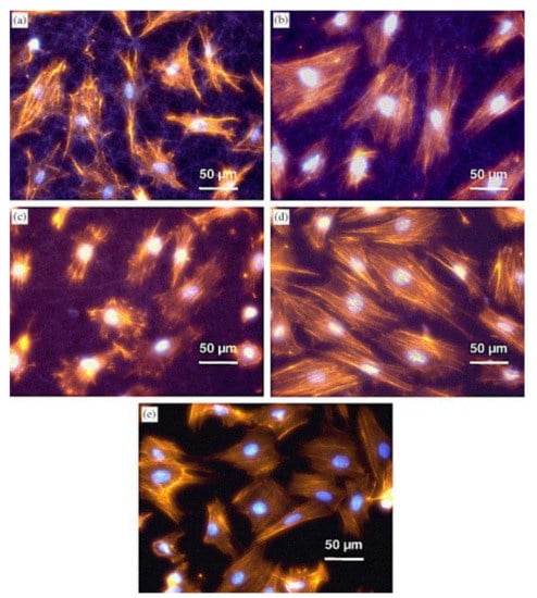 Morphology of myoblast cells 20 h after seeding on: (a) gelatin nanofiber mat; (b) 15:85 PAni-gelatin blend nanofibers; (c) 30:70 PAni-gelatin blend nanofibers; (d) 45:55 PAni-gelatin blend nanofibers; and (e) glass matrices. Staining for nuclei-bisbenzimide and actin cytoskeleton-phalloidin. Reprinted from [66], with permission from Elsevier.
