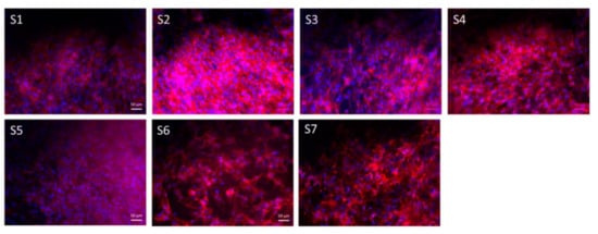 Fluorescent images of ST-2 cells on as-spun nanofiber mats of different PCL/PGS ratios S1–S7 after 7 days of incubation. Reprinted from [114], originally published under a CC-BY license.