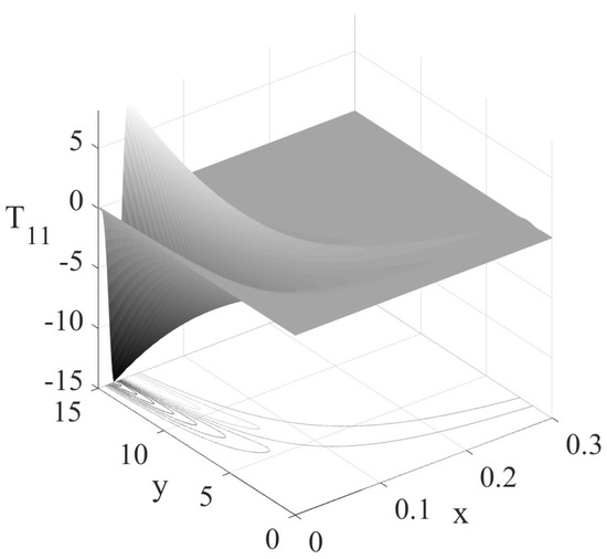 Figure 3. Stress component with a spatial resolution of , .Actually, the appearance of the singularity at or is independent from the choice of the arbitrary function . This can be easily recognized by observing the distribution of the stresses (31)–(33) along an arbitrary characteristic curve , where is non-zero finite constant. As an example, the term tends to be infinite at for or at for . These singularities are independent from the choice of and thus non-removable. However, possible singularity near the stagnation point can be effectively prevented by choosing a reasonable function , e.g., (34). This ensures that no singularity occurs in the stress field near the stagnation point. For a stagnation-point flow with the velocity field given by (13), the velocity becomes unbounded at or and is thus physically no longer meaningful. The singularity arising in the far field at or may not be relevant when a bounded stagnation-point flow is investigated. We should then focus on the analysis of singularity in a bounded area near the stagnation point. - (ii)