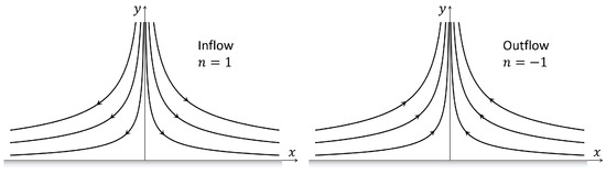where denotes the direction of the flow. As displayed in Figure 4, corresponds to the inflow toward the stagnation point and indicates the outflow away from the stagnation point.