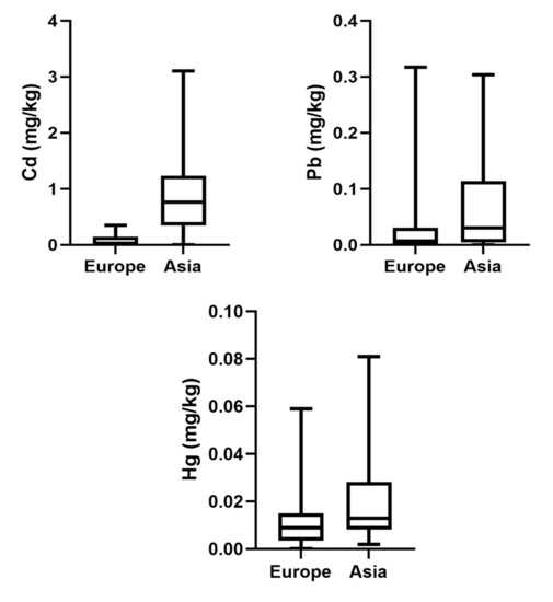 Figure 1. Comparison of the toxic metal content (Cd, Pb, Hg) between origins (Europe vs. Asia).