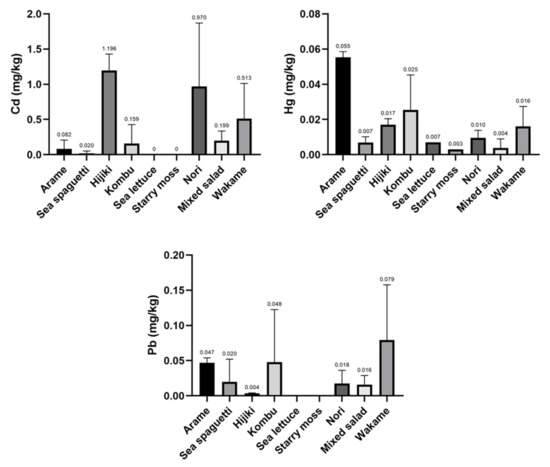 Figure 2 shows the mean concentrations of toxic metals (Cd, Pb, Hg) in the different species of analyzed algae. The differences found in the metal content between species are due to the intrinsic features of each species, with some species being more prone to accumulating some metals than others. Similarly, the statistical study confirmed the existence of significant differences (p < 0.05) in the content of Cd (arame vs. nori; sea spaghetti vs. hijiki, kombu, nori, mixed salad, and wakame; hijiki vs. kombu, mixed salad, and wakame; kombu vs. nori and wakame; nori vs. mixed salad and wakame), in the Pb content (arame vs. nori and mixed salad; sea spaghetti vs. wakame; hijiki vs. wakame; kombu vs. wakame; nori vs. wakame), and in the Hg content (arame vs. sea spaghetti, kombu, nori, mixed salad, and wakame; sea spaghetti vs. kombu, hijiki, and wakame; hijiki vs. nori and mixed salad; kombu vs. nori and mixed salad; nori vs. mixed salad and wakame).