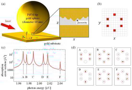 We demonstrate PiFM measurements of a single molecule using a simplified model to understand the microscopic interaction between the molecule and the localized plasmon. We consider a PiFM system and six-membered ring molecule by DDA with a discretized unit cell size of 1 Å, as shown in Figure 1a,b. In the present study, we put stress on discussing the relationship between the geometrical structure of a molecule and the PiFM image having spatial structures inside the single molecule. That is why we use the simplified model of a molecule. The results obtained by using the orbital functions of a more realistic model will be published elsewhere. The tip is assumed to be a 60 nm diameter gold sphere with several protrusions, forming picocavity, on the apex, which is known in the field of tip-enhanced Raman spectroscopy [,]. The substrate is assumed to be a gold thin film with a thickness of 9 nm. The susceptibility of the metallic substrate is given by the Drude model with the parameter of Au, and each of the six elements of the molecule are determined by the Lorentz model as follows: