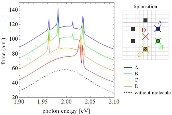 We discuss the PiFM (attractive force) spectra for the molecule, which are shown in Figure 2 as solid colored lines when the PiFM tip placed at each position. The dashed line represents the spectrum of the gold substrate, that is, in the absence of the molecule. The PiFM spectra show that PiFM has a high sensitivity for the wavelength of the incident laser, and different resonance states can be observed depending on the position of the tip, resulting in a high spatial resolution. This is due to the significant localization and enhancement of localized surface plasmons by the atomic-level spatial structure called picocavity at the tip apex []. In addition, a Fano-like structure with an asymmetric peak-dip structure appears near the molecular resonance energy in the PiFM spectrum. This can be caused by the interference effect between the broad plasmon resonance peak and the sharp molecular resonance peak, which has been explained in our previous work []. When light with energy lower than the resonance energy of the molecule is incident, the polarization of the plasmon and the polarization of the molecule are in phase. As these enhance each other, the photoinduced force is clearly observed in the direction of attraction. In contrast, when light with an energy higher than the resonance energy of the molecule is incident, the polarization of the molecule and the plasmon are in anti-phase, and they suppress each other. In this case, the polarization of the molecule was very small and only slightly weakened the plasmon. Therefore, the peak in the attraction direction was large, and the dip in the repulsion direction was small.