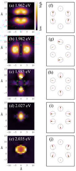 We calculated the PiFM images and polarization structures at each peak of the PiFM spectrum shown in Figure 2. As shown in Figure 3a–e, completely different PiFM images were obtained for each resonance energy of the molecule. The calculated spatial polarization structures for the respective PiFM images are shown in Figure 3f–j. Figure 3f,g are optically allowed transitions that can be excited under the long-wavelength approximation, whereas Figure 3h–j are forbidden transitions, where the average of the polarization inside the molecule vanishes. The difference between these PiFM images can be understood by the interaction with the electric field vector of the plasmon spreading isotropically from the tip apex. The features of these images agree with the discussion of a previous study on molecular imaging by TERS [].