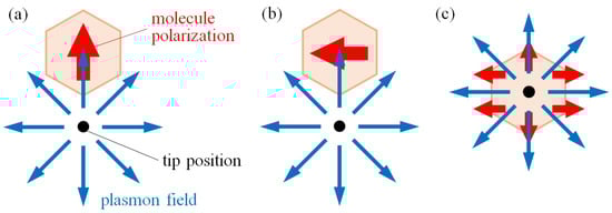 Excitable conditions of a molecule by plasmon (top view). The hexagon and red arrows represent the molecule and molecular polarization, respectively. The black dot represents the tip position and the blue arrows are the electric field vector of the localized plasmon induced at the tip-substrate nanogap. (a,b) show the excitable and non-excitable tip position conditions for the allowed transition of the molecule, as shown in Figure 3f,g, respectively. (c) shows the excitable tip position condition for a forbidden transition of the molecule, as shown in Figure 3j.