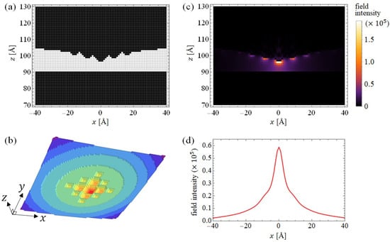 (a,b) show the model tip with picocavity in the cross-sectional picture of the tip center and the three-dimensional picture of the bottom view, respectively, in discretized space. The colors in (b) represent contour maps. (c) shows a map of the response field intensity from the viewpoint of (a). The intensity is determined as a ratio of the incident field, . (d) is the line profile of the field intensity at 3 Å below the tip apex.