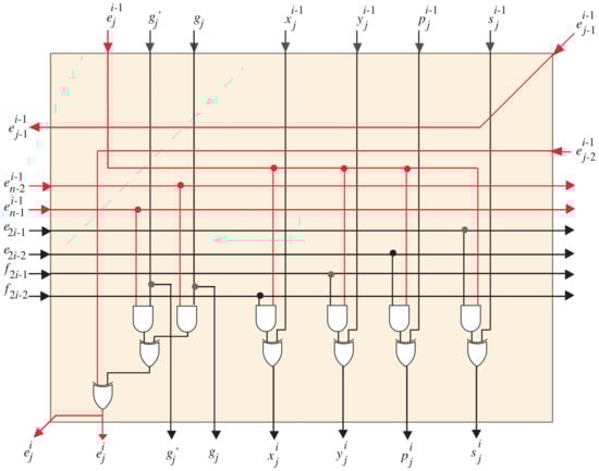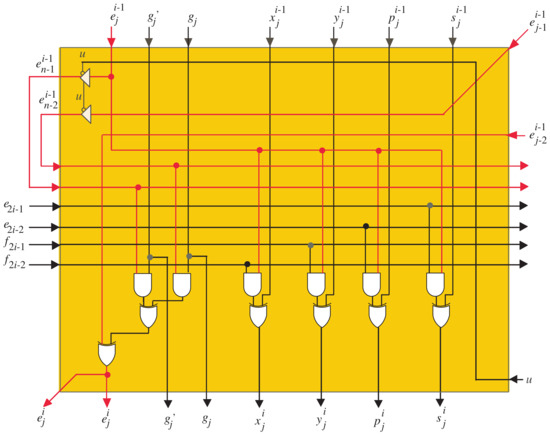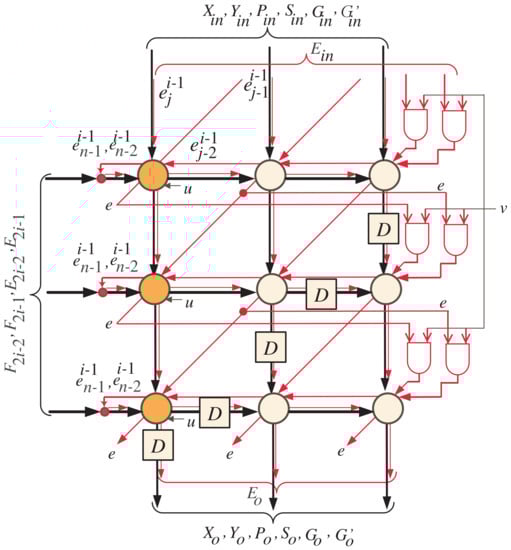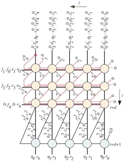 For the hardware implementation of Algorithm 1, we developed the corresponding bit-level form as shown in Algorithm 2. The algorithm has two nested loops to compute Steps 2 to 6 of Algorithm 1, the outer loop with the i index and the inner loop with the j index. Furthermore, there is a for-loop at the end of the algorithm to compute the postprocessing Steps 8 and 9 in Algorithm 1. e j i designates the (j)th bit of E at the ith iteration. Furthermore, x j i , y j i , p j i , and s j i designate the jth bit of X, Y, P, and S at the ith iteration, respectively. As we notice, the total number of iterations required to execute the algorithm is ( d + 1 ) n . The explored word-based SISO semisystolic processor will significantly reduce the total number of iterations, as will be explained later, to be ( d k + 1 ) n k , where k is the processor bus width.