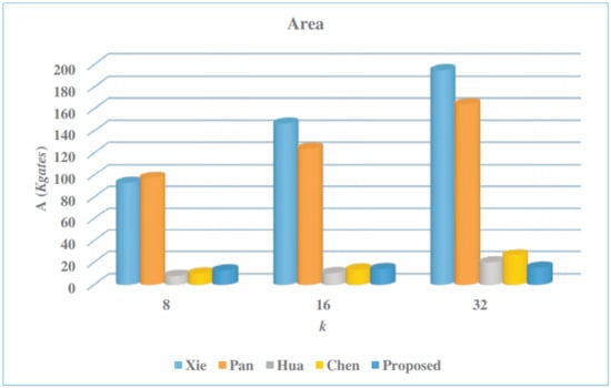 From Figure 10, we notice that the multiplier structure of Hua [60] achieved a lower area (A) at word sizes k = 8 and k = 16 , by at least 21.3% and 23.0%, respectively. In contrast, at the word size of k = 32 , the proposed multiplier-squarer structure achieved the smallest area by at least 22.95%. The reduction of the proposed structure’s area was mainly attributed to the significant decrease in the number of flip-flops as the word size increased, as we discussed before in the previous subsection.