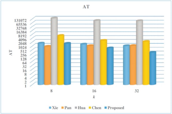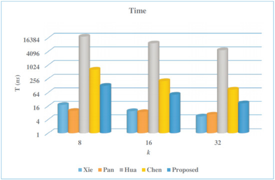 From Figure 11, we notice that the multiplier structure of Pan [45] achieved a significant reduction in time (T) at word sizes k = 8 and k = 16 due to its significantly lower latency. On the other hand, the multiplier structure of Xie [50] realized a slight reduction in T, at word size k = 32 , compared to that of Pan [45]. Due to the fluctuations in the obtained results of the latency, A, and T among the different multiplier structures at different word size, we added the Area–Time product (AT) metric to Table 2. The AT metric enabled us to discover the optimal multiplier structures in terms of area and time.