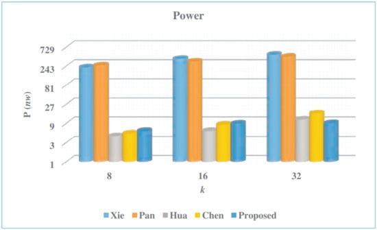 From Figure 13, we notice that the multiplier structure of Hua [60] had lower Power consumption (P) at word sizes k = 8 and k = 16 due mainly to the significant reduction in area. The decrease in area resulted in a reduction of the extracted parasitic capacitance and, hence, reduced the circuit’s switching activities. The proposed multiplier-squarer structure had slightly higher power consumption over the multiplier structure of Hua [60] at the same word sizes of k = 8 and k = 16 . In contrast, it had a slightly lower power consumption than the multiplier of Hua [60] at word size k = 32 due to its smaller area at this word size.