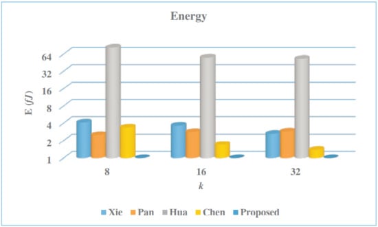 Despite having lower power consumption at word sizes k = 8 , and k = 16 , the multiplier of Hua [60] had significant values of consumed energy, as shown in Figure 14, due to the tremendous amounts of its execution Time (T). The proposed multiplier-squarer had the lowest consumed energy, as shown in Figure 14, at all word sizes due to the reasonable values of its execution Time (T), as well as the lower values of the consumed power. The proposed multiplier-squarer reduced the consumed energy at word sizes k = 8 , k = 16 , and k = 32 by at least 70%, 72.4%, and 86.2%, respectively.