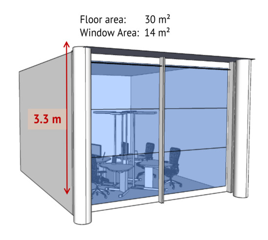 The model of the test room represents an office space (see Figure 1). It contains a south-oriented fully glazed window with an area of 14 m and a window wall ratio of 90%. The window is divided into three different zones namely the top, middle and bottom. The room is 6 m in length, 5 m in width, and 3.3 m in height with a floor area of 30 m.