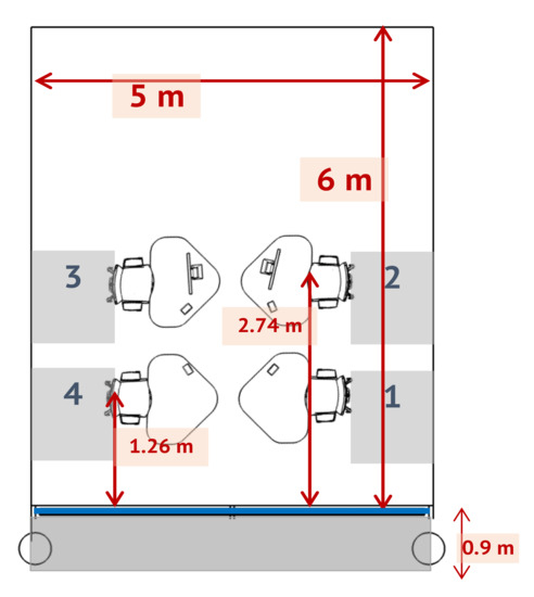 The layout of the room can seat four occupants in each of the four workspaces. Each of the workspaces is suitable for executing common office tasks and the occupant’s line of sight is at a height of 1.2 m above ground. The seating configuration of the occupants is shown in Figure 2. The occupants in workspaces 1&4, 2&3 face each other.