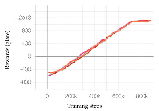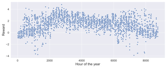 Figure 19 shows the combined rewards achieved by the DQN agent for both daylight maximization and glare reduction. It can be observed that there are several negative rewards during the start (0–2000 h) and end of the year (above 6000 h). Although the DQN agent could reduce the glare and bright daylight hours significantly, the low light hours caused a significant penalty.
