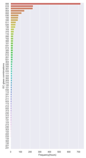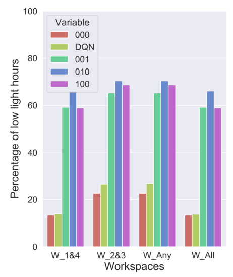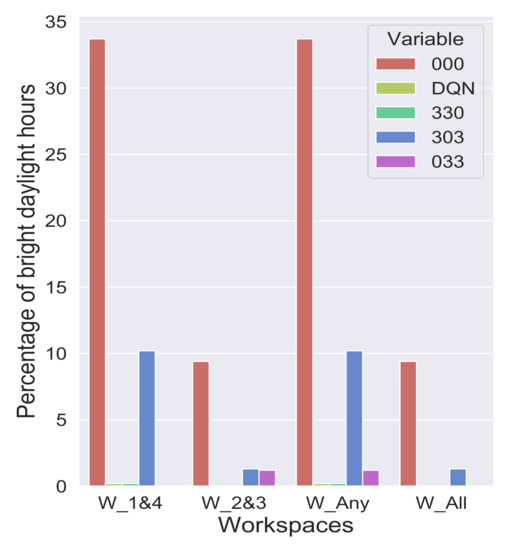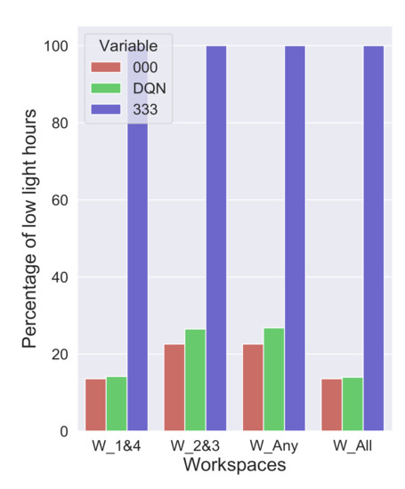 Using the EC glass in an always clear (000) combination for the entire year defeats the sole purpose of EC glass altogether and, furthermore, this combination can cause a lot of glare which is explained in Section 3.2. Any combination other than 000 (see Figure 11), with one of the zones tinted to a slightly higher level than clear, can increase the low light hours enormously. The combinations 001, 010, 100 have low light hours of about 59%, 69%, 59%, respectively, which means they make the daylight situation even worse at the workspaces. Any sequence of combinations that utilizes mostly 000 and any darker tints occasionally to reduce glare can provide better daylight. The DQN algorithm provides exactly the right set of combinations to reduce low light hours. The low light hours by the DQN are only a little higher than the 000 combination, i.e., 4% higher at workspaces 1 and 4 and 7% higher workspaces 2 and 3, respectively.