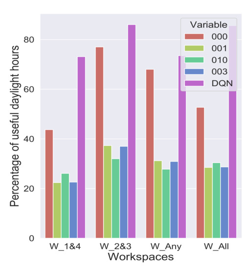 Figure 13 shows the combinations of 000, 001, 010, 003. Of these combinations, 000 makes available maximum useful daylight of only 43% in workspaces 1 and 4 and 78% in workspaces 2 and 3. The combinations 001, 010, 003 can only provide useful daylight in 22–25%, 33–38% in workspaces 1 and 4 and workspaces 2 and 3, respectively. It can be observed that changing any of the zones of the glass in combination 000 reduces the available useful daylight almost by half. In contrast, the DQN agent effectively uses a set of combinations EC glass to provide useful daylight about 75% in workspaces 1 and 4 and 90% in workspaces 2 and 3.